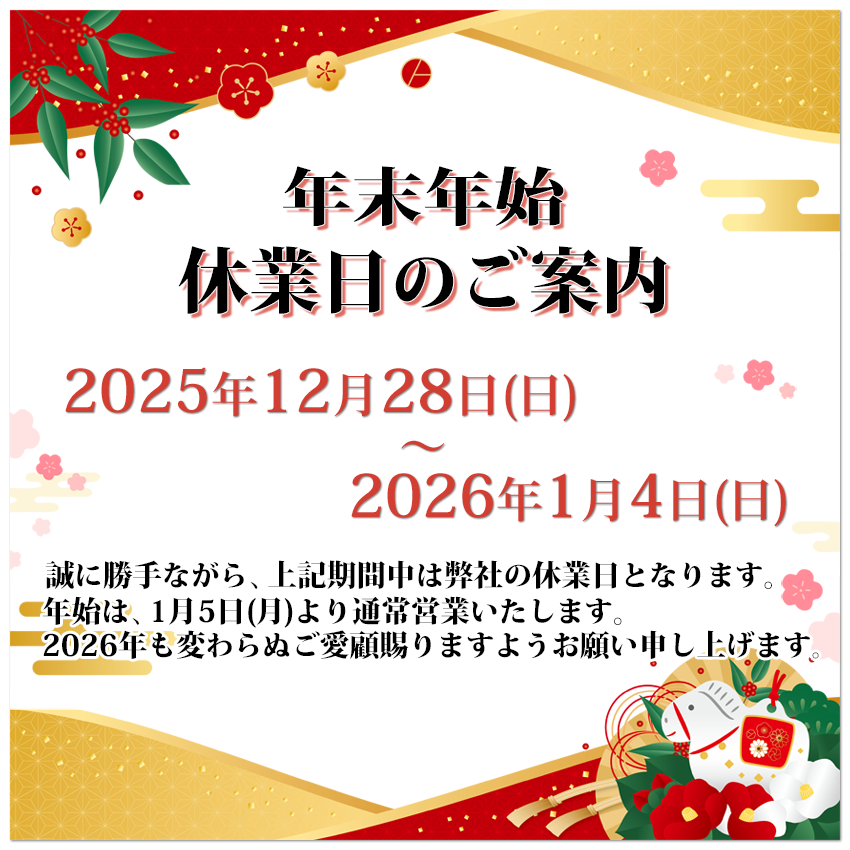 誠に勝手ながら、弊社では下記の期間を年末年始の休業とさせていただきます。